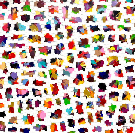 L’artiste est avant tout une coloriste, faisant jaillir les couleurs fortes et vives exprimant sa fougue, sa détermination et son audace. Et de l’audace il en faut pour révéler la couleur en la cachant. Le carré blanc par touche vient à la fois masquer et révéler le déferlement des teintes qui sont derrière.